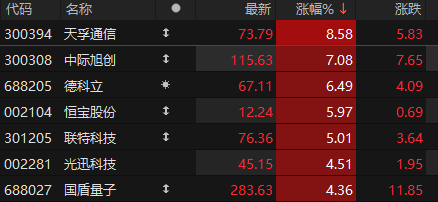 上证报中国证券网讯 6月12日早盘,通信板块震荡走强。截至9时46分,天孚通信涨超8%,中际旭创涨逾7%,德科立涨逾6%,恒宝股份、光迅科技等跟涨。